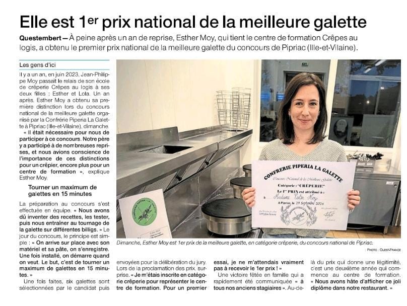 Esther Moy, formatrice à crêpes au Logis a obtenu le 1er prix en catégorie "crêperie" au concours National de la galette de Pipriac 2024.